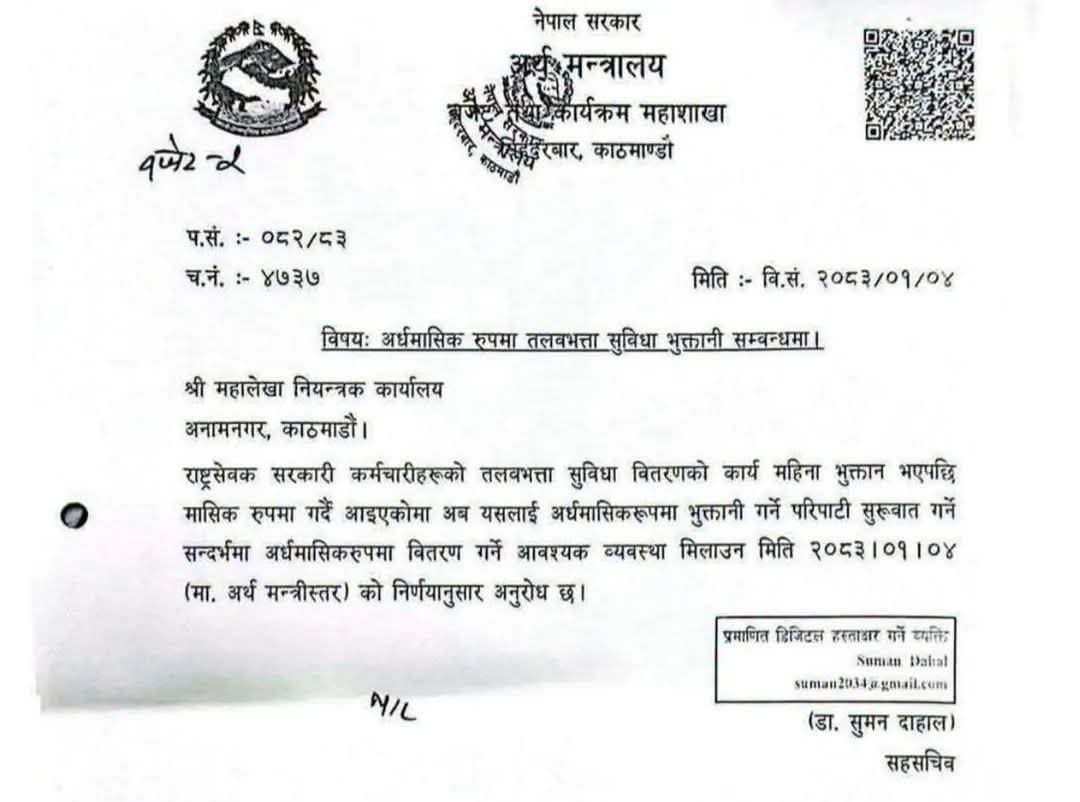 नेपाल सरकार, अर्थ मन्त्रालय ले सरकारी कर्मचारीको तलबभत्ता वितरण प्रणालीमा परिवर्तन गर्ने तयारी अघि बढाएको छ। हाल मासिक रूपमा भुक्तानी हुँदै आएको तलबभत्ता अब अर्धमासिक (महिनामा दुई पटक) रूपमा वितरण गर्ने योजना बनाइएको छ। यस सम्बन्धमा मन्त्रालयले महालेखा नियन्त्रक कार्यालय लाई आवश्यक पूर्वतयारी गर्न निर्देशन दिएको छ।