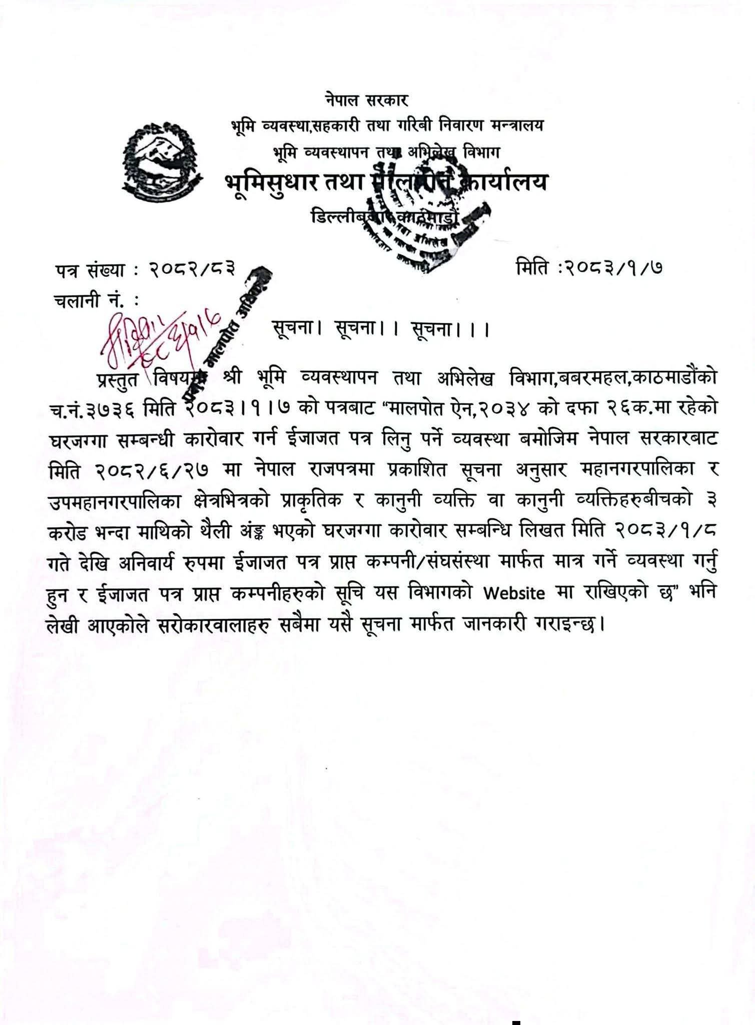काठमाडौं — भूमि व्यवस्थापन तथा अभिलेख विभाग ले घरजग्गा कारोबारसम्बन्धी नयाँ सूचना जारी गर्दै कानुनी व्यक्तिसँग सम्बन्धित कारोबारमा कडाइ गरेको छ। विभागको डिल्लीबजार, काठमाडौंस्थित कार्यालयबाट जारी सूचनामा विशेष गरी उच्च मूल्यका कारोबारलाई लक्षित गरिएको छ।